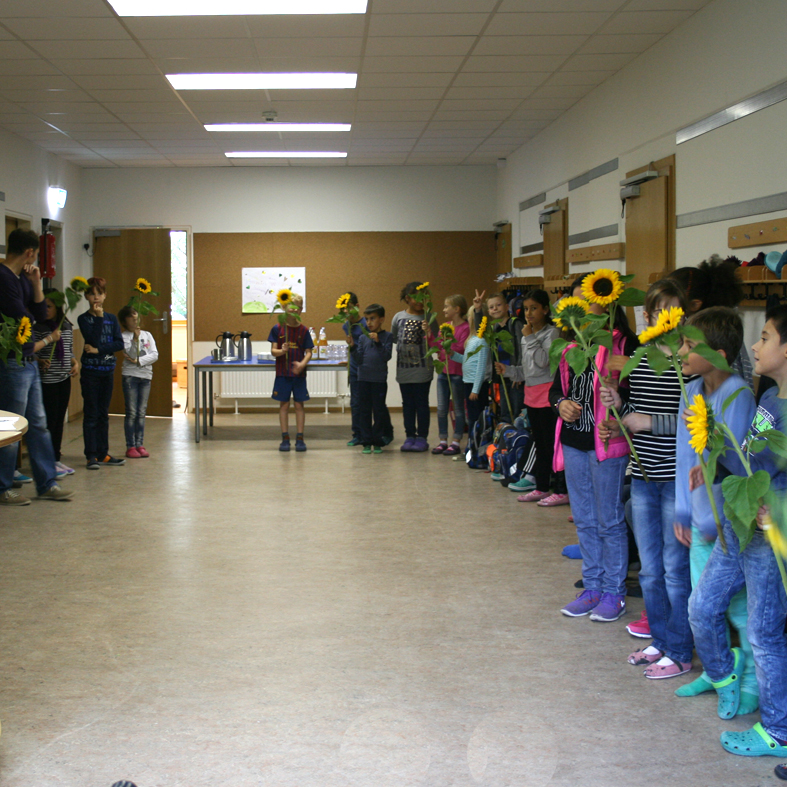 Trotzdem wollten wir am Hort vorbei. Ich hatte blöderweise den Punkt verpasst, dass sich alle Hortkinder nach der Schule treffen und zusammen zum Hort gehen. Und so durfte der midi-monsieur die feierliche Begrüßung ganz für sich allein genießen. Das war schon toll: Alle Hortkinder standen Spalier, applaudierten und riefen „hurra“. Eine Sonnenblume gab es auch fürs Kind. Doch, so ein Aufnahmeritual hat durchaus was. Das fand der midi-monsieur auch.