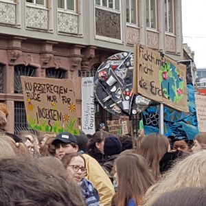 Auf 12h00 war der Start der Frankfurter „Fridays for Futur“-Demo angesetzt. 12h00 ist für einen Schulstreik eine recht moderate Uhrzeit. Da zum Beispiel beim Kind die 5. Stunde ausfiel, hatte er um 11h30 Schulschluss. Damit hätten wir es durchaus pünktlich zum Treffpunkt geschafft. Aber die Demo war für 3 Stunden angesetzt, es regnete und ich musste auch noch was zu Ende arbeiten, als der midi-monsieur um 11h40 zu Hause war. Um 13h45 machten wir uns dann endlich auf den Weg. An der Hauptwache trafen wir auf den Demozug und reihten uns ein.