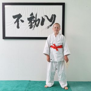 Stolzer Aikidoka mit organgem Gürtel - mich mit der Co-Elterbeirätin besprochen