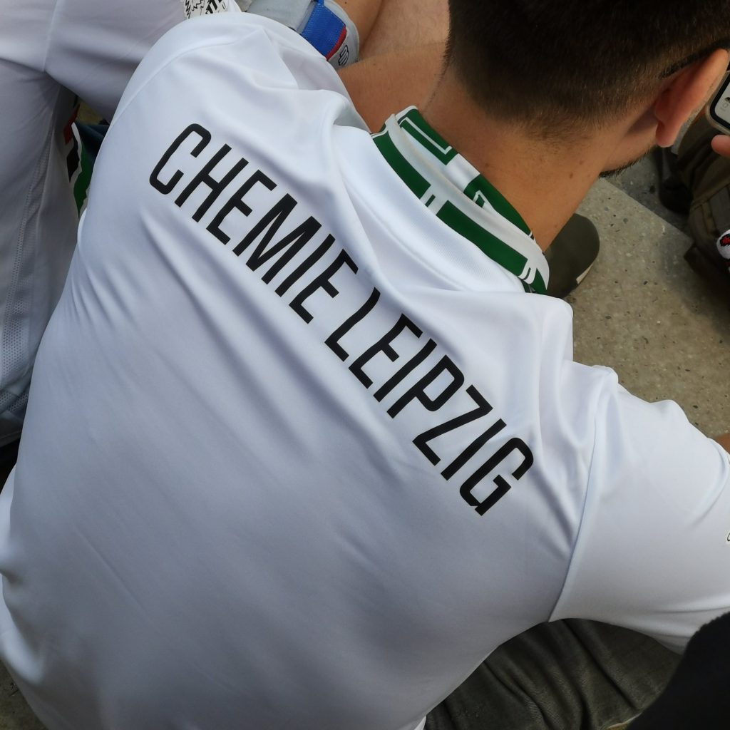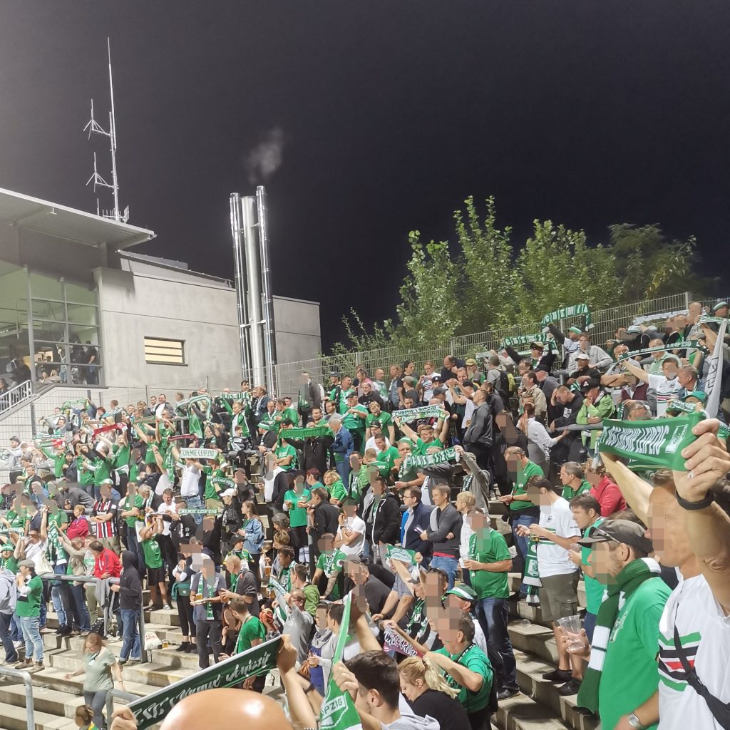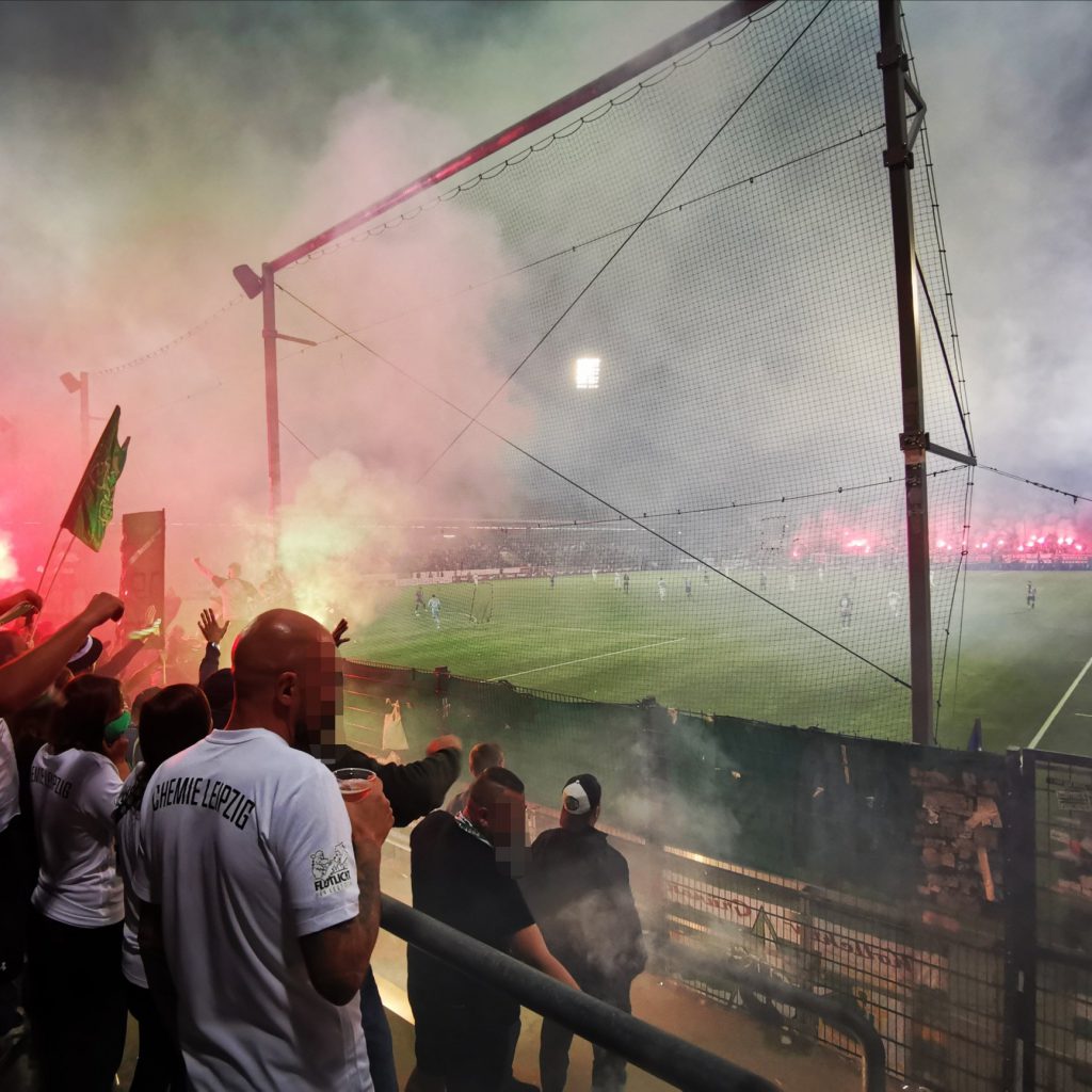 Tja, da standen wir dann heute auch. Mittendrin zwischen den Fans aus Leipzig. Und es war toll. Ich habe nicht ganz so viel vom Spiel mitbekommen, weil mich das Drumherum deutlich mehr in den Bann gezogen hat. Ich musste kurz das Kind mental einfangen, weil er anfangs etwas unlaunig war*. Außerdem kamen wir mit ein paar Chemie-Fans ins Gespräch und ich erfuhr einiges über deren Verein, deren Fans (durch und durch antifaschistisch) und über die nur 15-jährige Freundschaft der Eintracht- und Chemie-Fans.