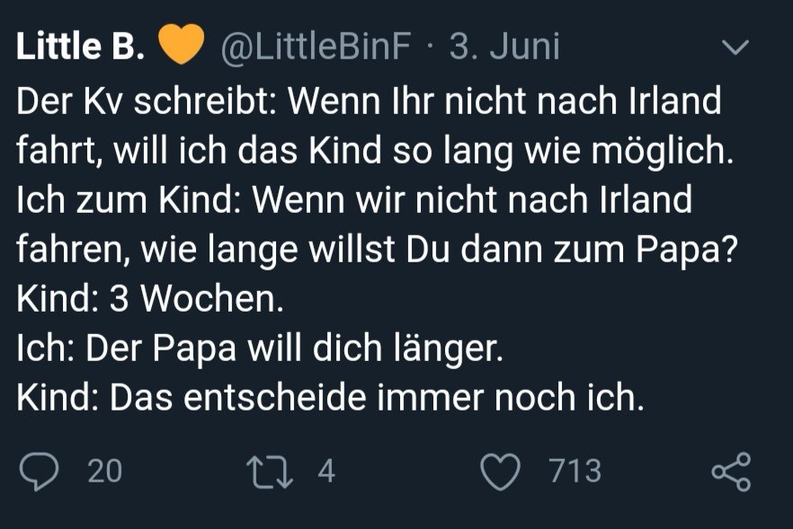 Nicht nur, dass der so viele Likes hats, sondern dass er auch geretweetet wurde – und zwar nur von Menschen, die mir nicht folgen. Außerdem schien er einige Menschen sehr zu triggern – eigene Trennungskindgeschichte, Rosenkrieg. Väterrechtler hatte ich mir zum Glück nicht eingefangen. Aber dennoch führte ich absurde Diskussionen dazu mit Menschen, die ich nicht kenne, die mir nicht folgen, die die Geschichte dahinter nicht kennen. Ich musste halt arbeiten und hatte so leider nur kurz Zeit für Amüsemeng. Aber mal im Ernst: Dinge einfach stehen lassen geht nicht, oder?!