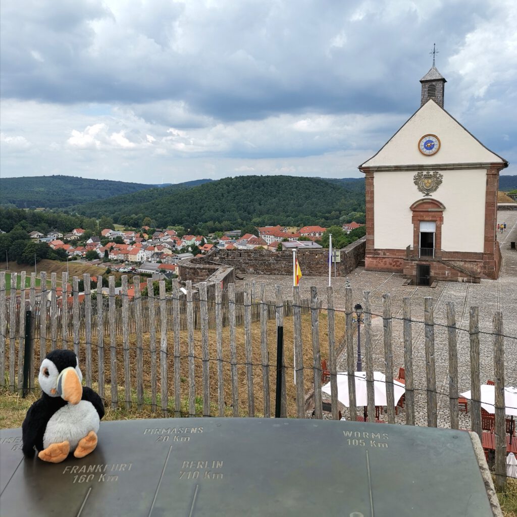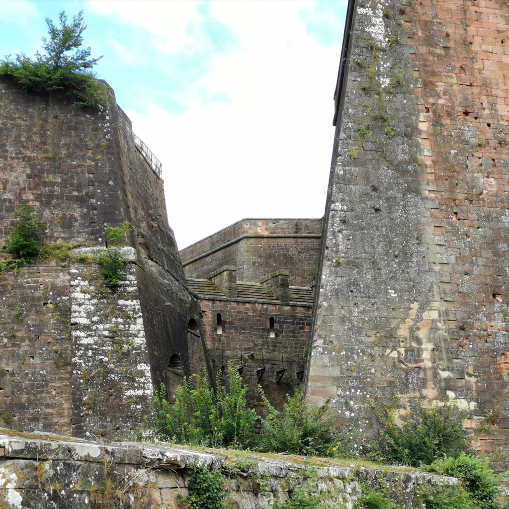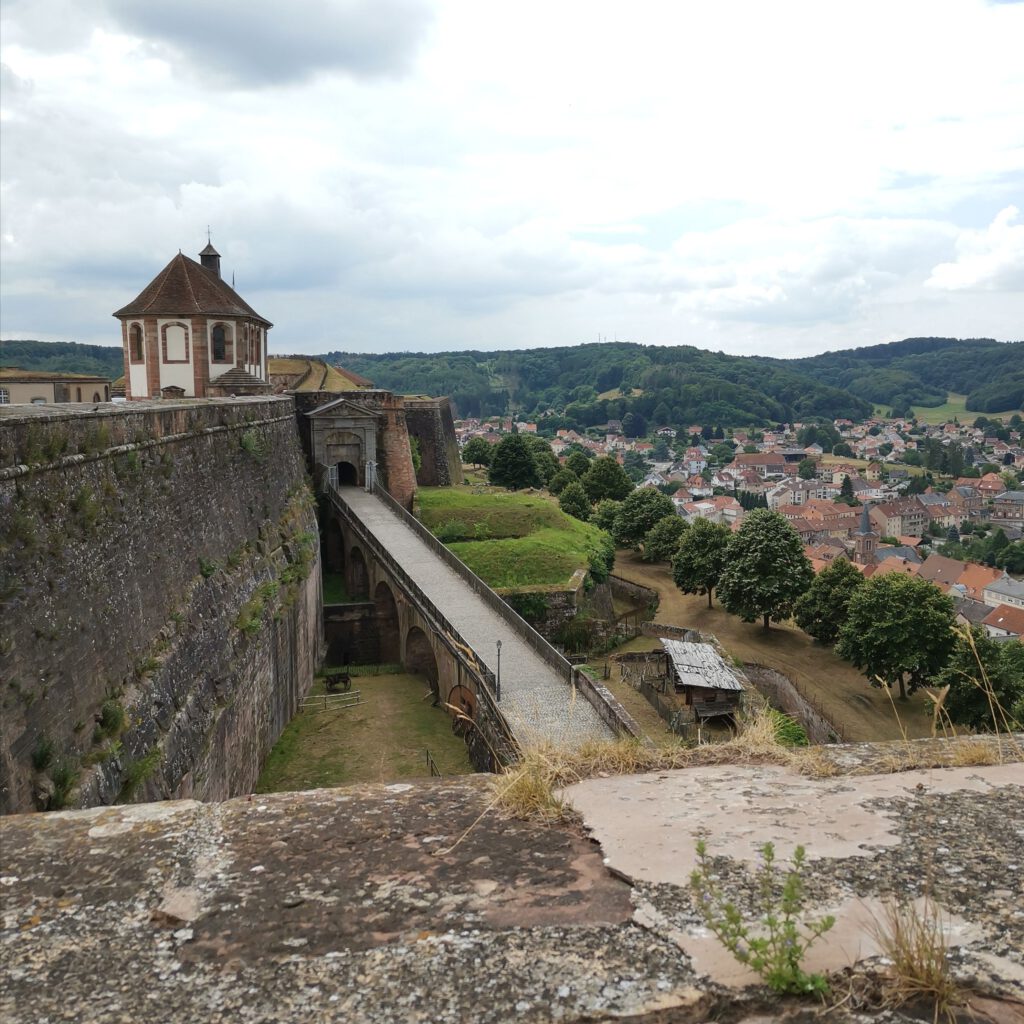 Keine Wanderung heute. Immerhin können wir Bitche nicht verlassen, ohne auf der Burg gewesen zu sein. Nach einen späten Frühstück gehen wir zur Mittagszeit los. Der Aufstieg ist immer noch steil und anstrengend. Um zum Eingang zu kommen müssen wir einmal an der Langseite lang.