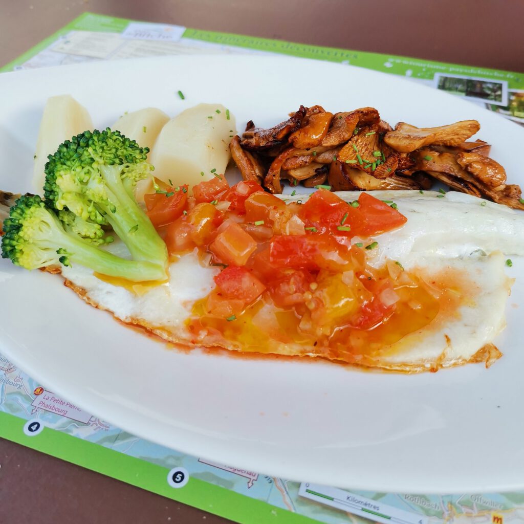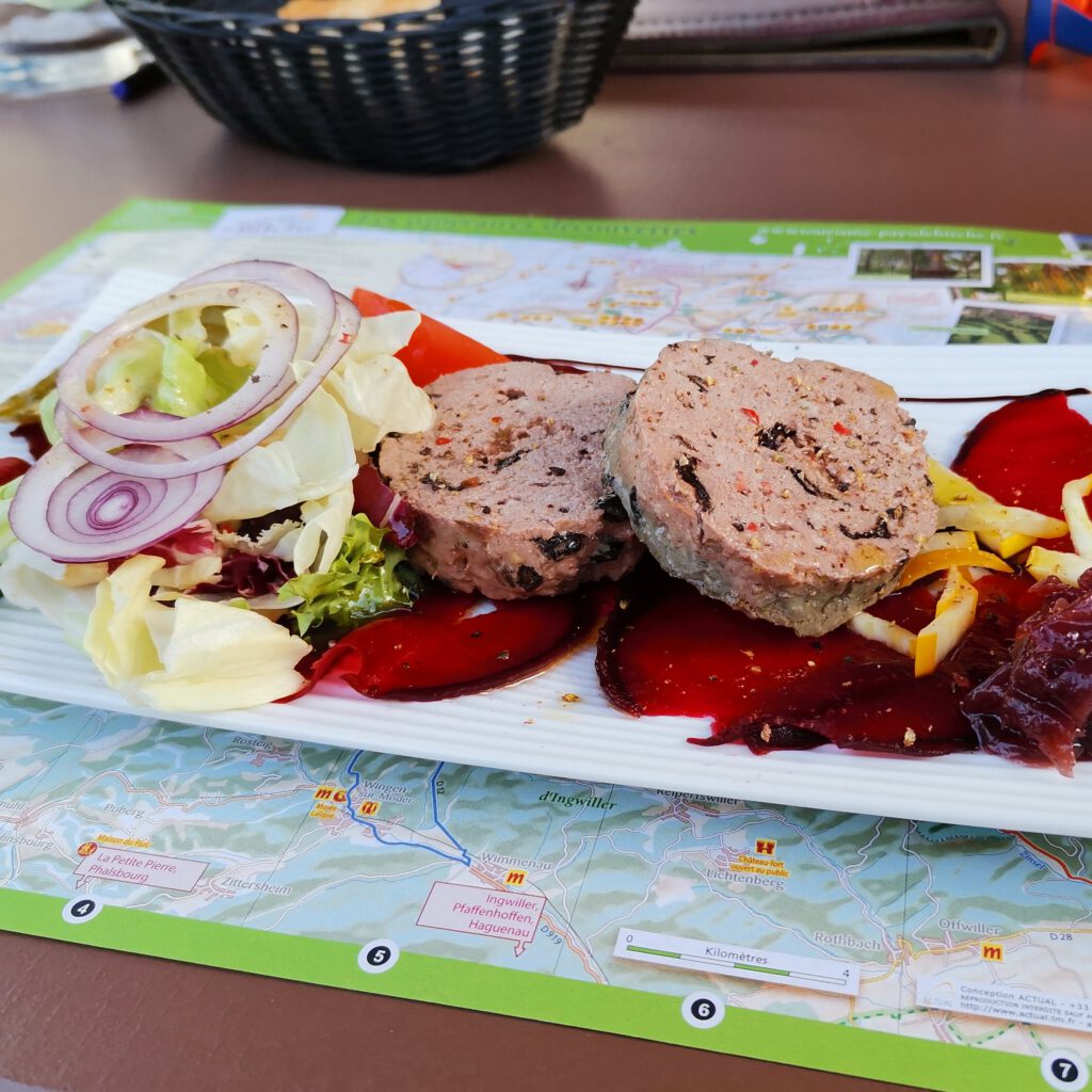 Ein schöne letzte Wanderung. Den Schlenker zum Chateau de Waldeck sparen wir uns, wir sind ausgepowert und hungrig und fahren entspannt zum ausgewählten Lokal. Das sich als sehr gute Wahl herausstellt.