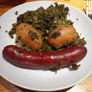 Die Kartoffeln (Drillinge) haben wir direkt im Grünkohl gegart. Das geht super und ist sehr lecker. (Und Notiz für mich: Es muss nicht immer frischer Grünkohl sein, TK-Grünkohl tut es sehr gut auch und ist einfacher zu verarbeiten.)