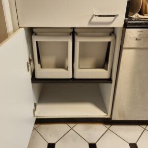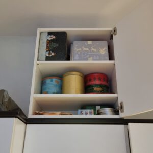 - Platz in der Küche: Wir wohnen in einem Altbau und oberhalb der Oberschränke ist noch sehr viel Platz. Verschenkter Platz. Im Keller hatten wir noch einen Oberschrank, der jetzt den Beginn einer zweiten Reihe ist. Außerdem war da ja noch der Schrank, in dem der Einbaukühlschrank war: Für den habe ich Böden besorgt. Und schwupps haben wir viel mehr Raum in der Küche und können endlich mal in der Wohnung verteiltes Geschirr und die Keksdosen in der Küche unterbringen.