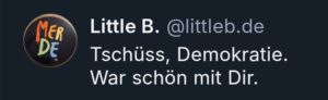 Es ist ein Privileg, die Klappe aufmachen, Haltung zeigen zu können. Immer wieder mache ich mir bewusst, wie priviligiert ich als weiße, mittelalte, nicht-behinderte, cis, hetero Frau mit deutschem Pass, akademischen Abschluss und einem gut bezahlten Job bin. Neben dem Frausein diskreditiert mich „nur“, dass ich alleinerziehend bin. Ich werde vorerst noch keine Einschnitte in meinem Leben spüren. Wenn es global nicht total eskaliert, werde ich die erste Legislatur unter Fritze wohl „unbeschadet“ überleben.