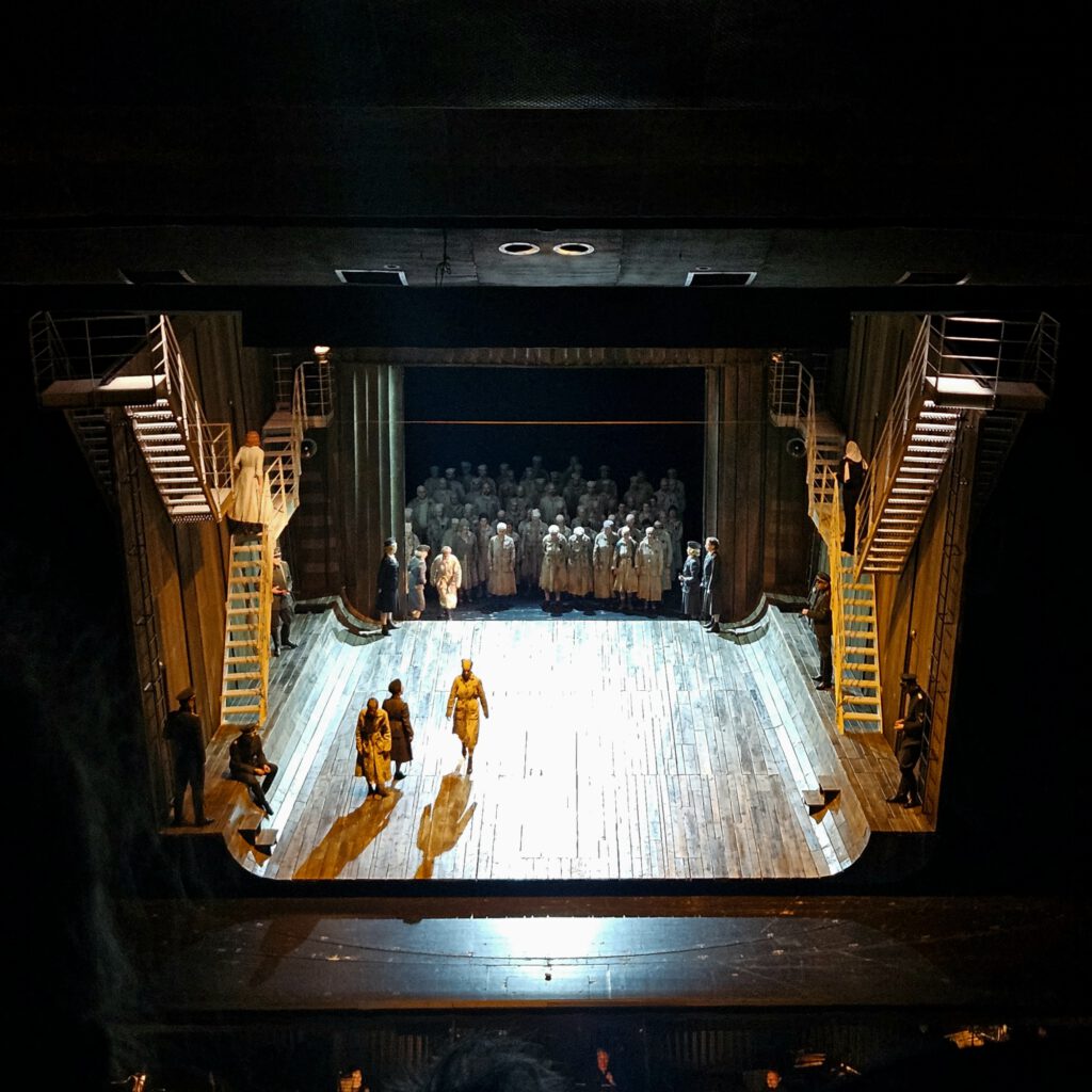 Wie in Frankfurt gewohnt, war es musikalisch und gesanglich top. Diesmal gab es recht viel Bühnenbild und Kostüm. Gerade das Bühnenbild mit dem Schiffsrumpf auf der Drehbühne hat die Inszenierung bestens unterstützt. Die Musik von Weinberg schafft es krass, ein beklemmendes Gefühl zu erzeugen und unterstreicht jedes Bild perfekt. Nein, es ist keine Oper der großen Arien wie eins es aus alten Meisterwerken kennt. Die Musik ist für die gesamte Geschichte gemacht, nicht um einzelne Figuren gesanglich hervorzuheben.
