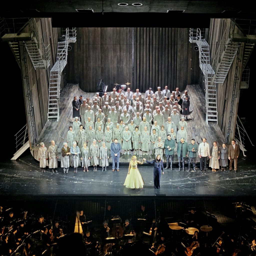 Es war das erste Mal, dass es keinen Pausenapplaus gab. Und nicht, weil es nicht gefallen hat, sondern weil der 1. Akt damit endete, dass Namen und Nummern von Auschwitz-Häftlingen projiziert wurden. Es fühlte sich einfach falsch an, dabei zu applaudieren. Das Stück macht(e) sehr nachdenklich und auch sprachlos. Hier auch ein großes Lob an die schauspielerische Leistung aller Akteur*innen. Das war sehr intensiv. Es nimmt eins mit. Sowohl in der Pause, als auch am Ende des Stücks waren wir etwas benommen und mussten wieder zurückkehren in Hier und Jetzt.