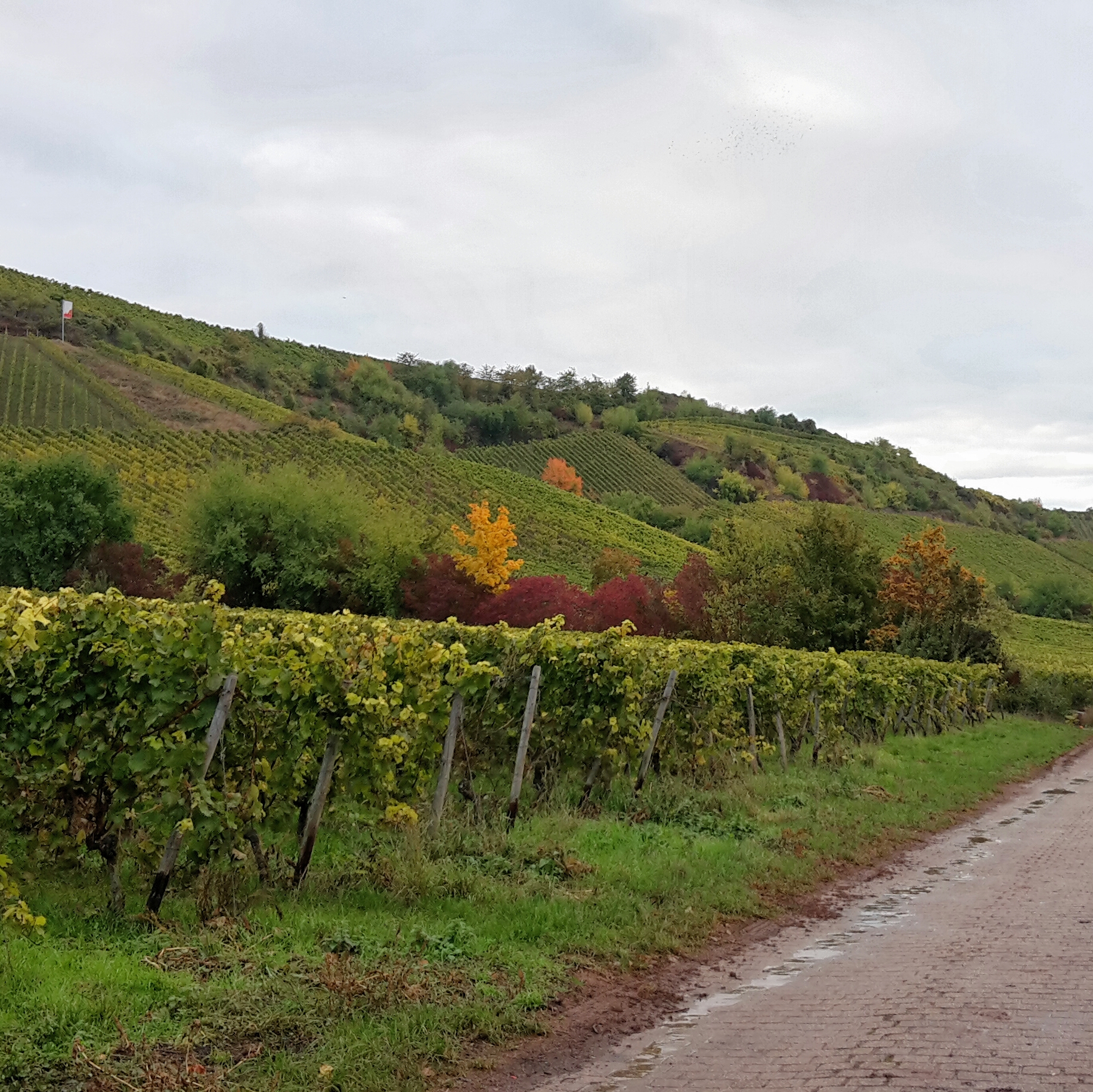 Und da hatte es schon aufgehört zu regnen. Die neue Jacke und die nicht neue Regenhose waren bestens. Für die Füße brauche ich dann wohl noch Gamaschen. Ich radelten über Feldwege durch die Wingerte. Es roch nach Trester. Und die Gegend war toll. Ich war mir wirklich dankbar, losgefahren zu sein.